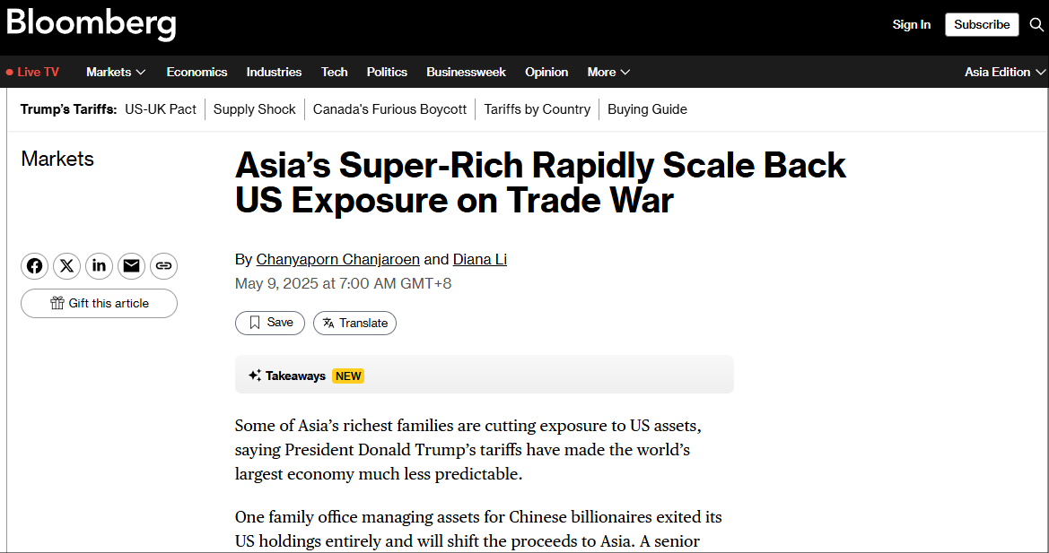 【环球网财经综合报道】 在全球经济格局剧烈动荡的背景下,亚洲顶级富豪家族正以前所未有的速度撤离美国市场。据彭博社在内的多家媒体报道,包括香港Infinity Family Office在内的约10家管理数十亿美元资产的超级富豪家族办公室,已开始大规模减持或冻结在美股及美债的投资,并将资金重新配置至中国和欧洲市场,以应对美国政策不确定性与潜在的经济衰退风险。